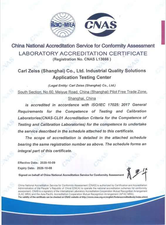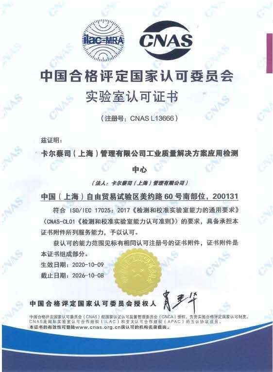 近日,卡尔雅安蔡司(上海)管理有限公司工业质量解决方案应用检测中心经过中国合格评定国家认可委员会(CNAS)严格的现场评审和后续考察,正式通过了最终审评并获得实验室国家认可证书。至此,标志着蔡司应用检测中心具有了国家及国际认可的管理水平和校准能力。